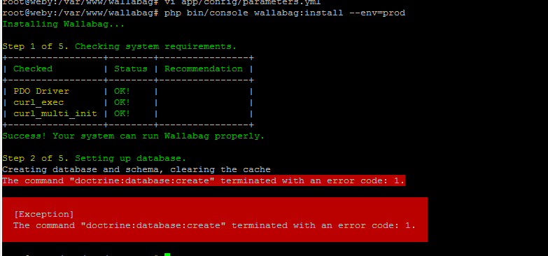 Lors de mes essais, j’ai rencontré l’erreur « doctrine:database:create » avec un code erreur 1.